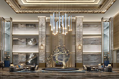中餐厅入口处的重复金属斗拱设计,带来中式迎宾的尊贵仪式感,端景墙的实木阴刻风景画,延展视觉空间,意境悠远。中餐大厅装饰台的茶具、枯枝花艺,构造古朴静雅的中式意韵,包房中形如凤冠的艺术水晶灯,为典雅增添一抹高贵。
